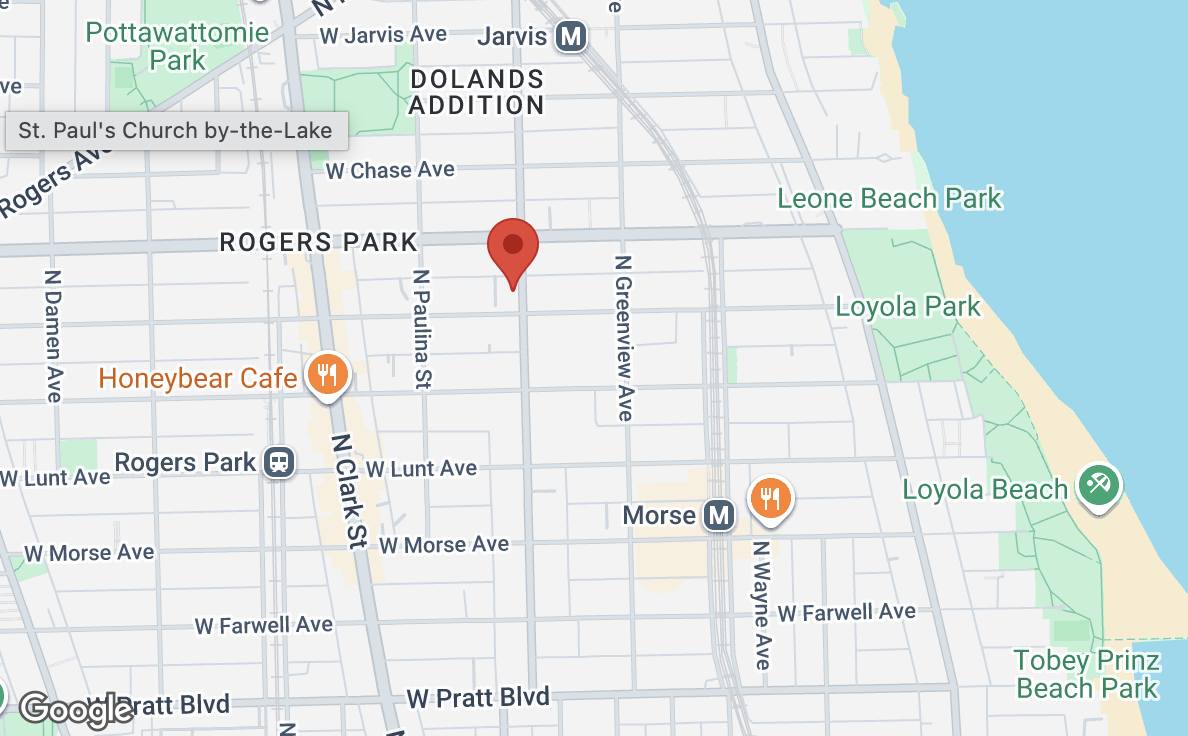 CTA: St. Paul's is located around 10 mins walking from the Morse or Jarvis Redline El stops. Nearby bus routes include the 22 Clark, 155 Devon, 96 Lunt (weekdays only).
